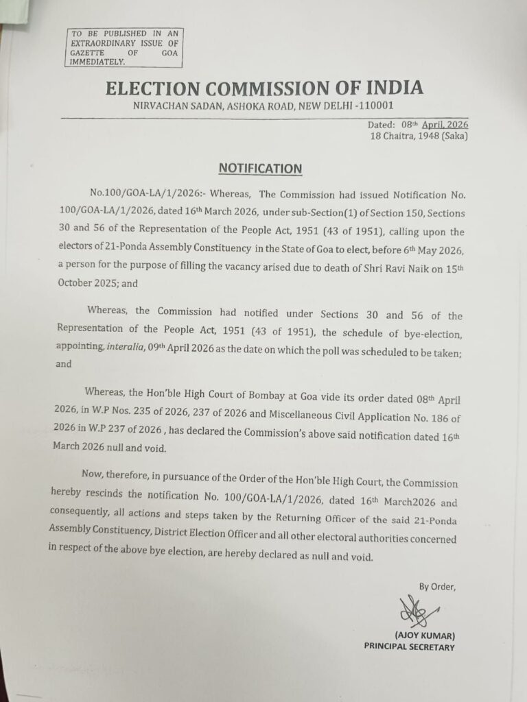 In a notification issued on April 8, 2026, the Commission stated that its earlier order dated March 16, 2026—calling for a by-election to fill the vacancy caused by the demise of former MLA Ravi Naik—has been declared “null and void” by the court.